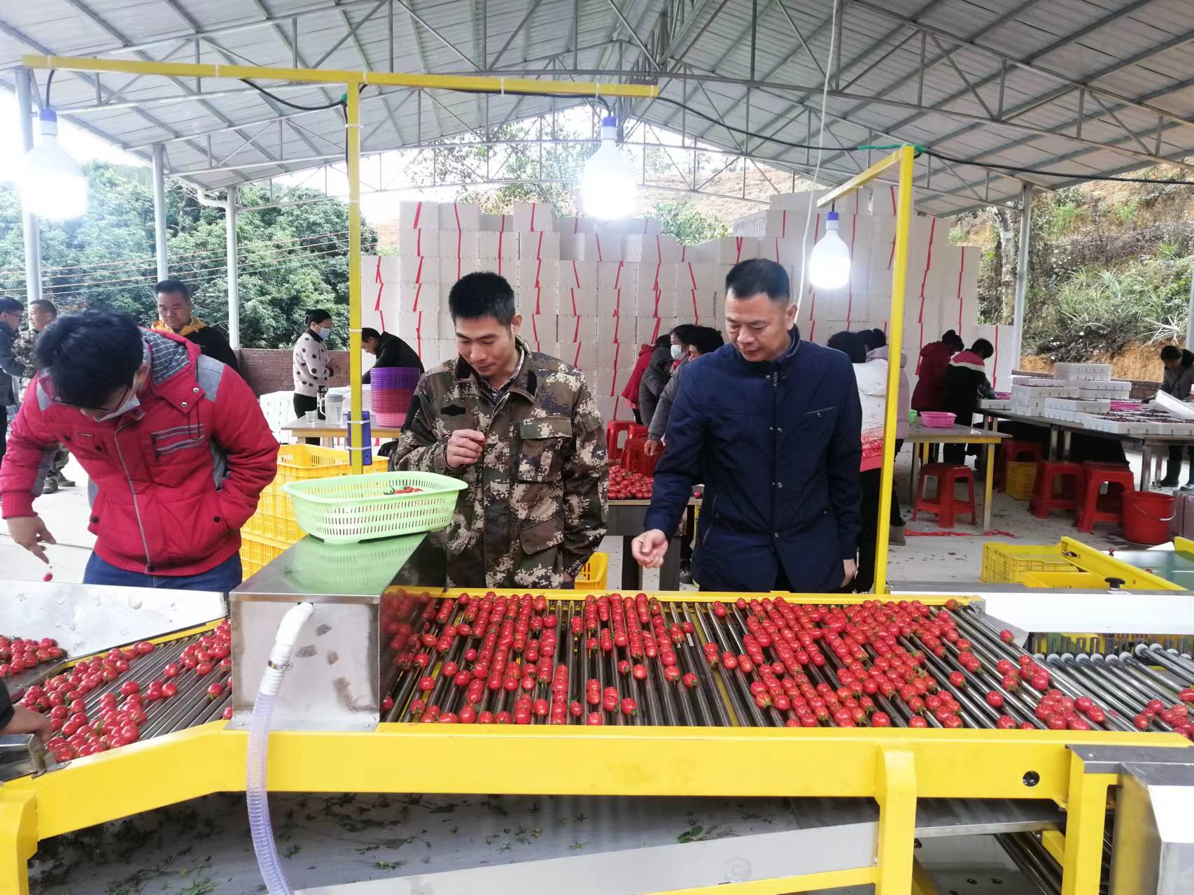 走進現(xiàn)場,大家的臉上都洋溢著豐收的喜悅,翠綠挺拔的番茄枝干上,一串串色澤鮮亮的“紅燈籠”掛滿枝頭,生機盎然。采摘工人十分忙碌,他們有條不紊地進行著采摘、分揀、入庫等相關(guān)流程。據(jù)了解,采摘圣女果產(chǎn)量日均約2000市斤。