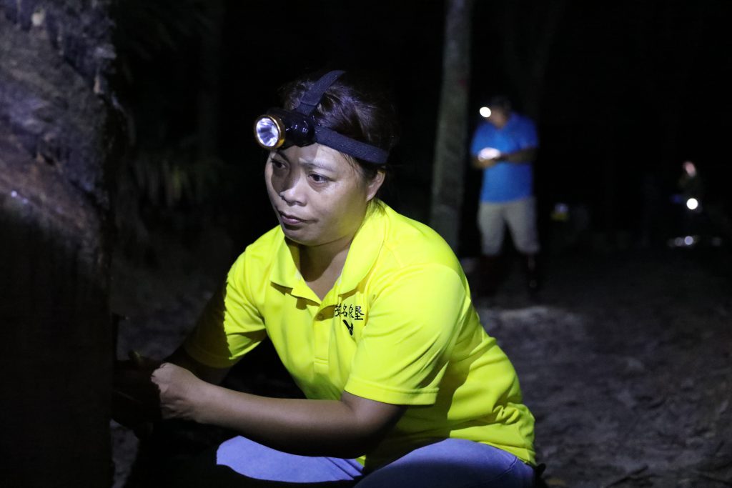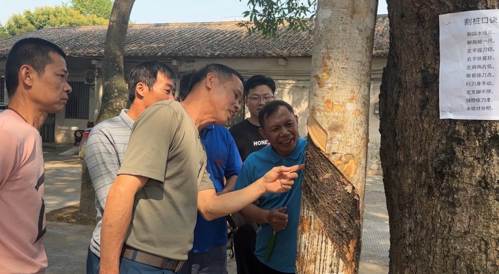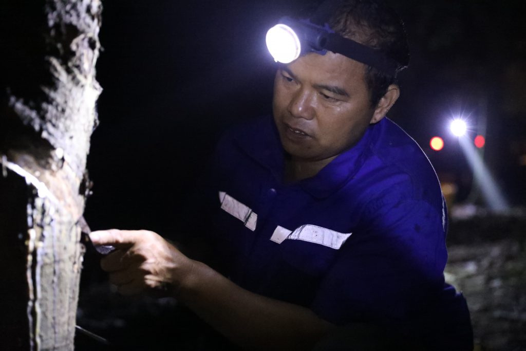 技術創(chuàng)新驅動產(chǎn)業(yè)質變。“下刀時,身體最好正對上水線,由左手腕用刀,右手拇指和食指捏住下刀翼穩(wěn)定膠刀……”在團結農(nóng)場培訓現(xiàn)場,全國割膠能手查明飛正示范“三穩(wěn)四準”操作規(guī)范,70名學員在特種膠園中接受毫米級精度訓練。團結農(nóng)場負責人表示:“每提升1%的割膠規(guī)范度,可延長橡膠樹經(jīng)濟壽命3-5年,這是推動產(chǎn)業(yè)從“量”到“質”躍遷的關鍵突破口?!眲倮r(nóng)場內(nèi),電動膠刀“唰唰”作響,橡膠樹皮迅速翻飛,割膠輔導員邊講解邊示范,學員們屏息凝神看手法、聽指導,認真學習領會低線、反手推刀、陰刀、下刀、收刀等技術要領。水豐農(nóng)場則設置夜間割膠實戰(zhàn)模擬,通過低光、溫差等復雜環(huán)境訓練,有效提升膠工技術穩(wěn)定性。
