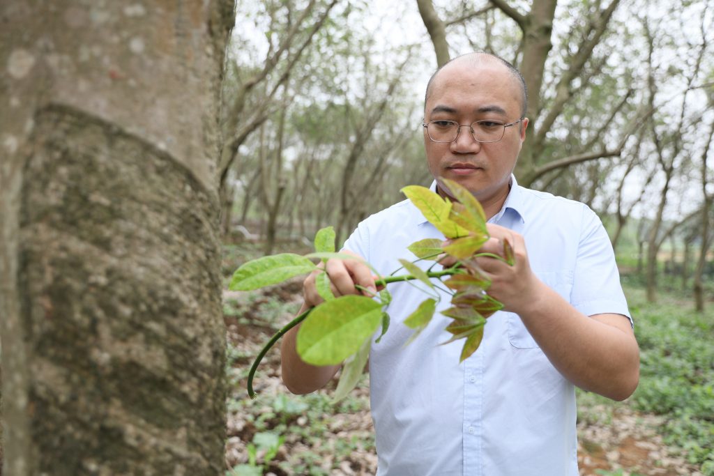 鄭杰在膠園察看橡膠物候情況