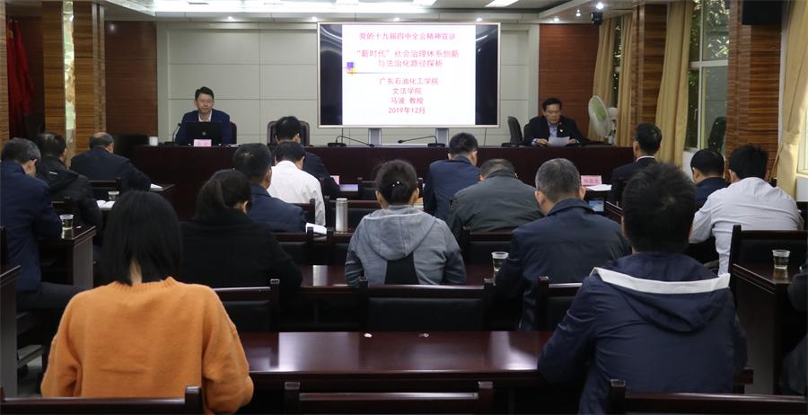 會(huì)上,馬教授以“新時(shí)代社會(huì)治理體系創(chuàng)新與法治化路徑探析”為題,從何為“新時(shí)代”、社會(huì)治理體系如何創(chuàng)新和社會(huì)治理體系創(chuàng)新的法治化路徑三個(gè)方面,結(jié)合具體的國際熱點(diǎn)問題和茂名的發(fā)展現(xiàn)狀,闡述了中國特色社會(huì)主義制度的優(yōu)越性和國家治理模式的優(yōu)勢(shì),加深了廣大黨員干部對(duì)黨的十九屆四中全會(huì)精神的認(rèn)識(shí)和理解。