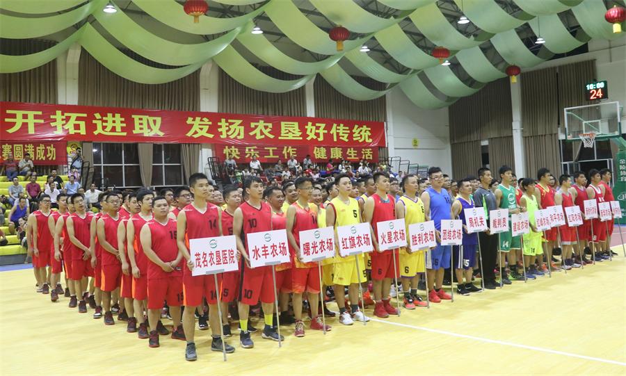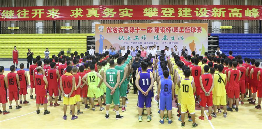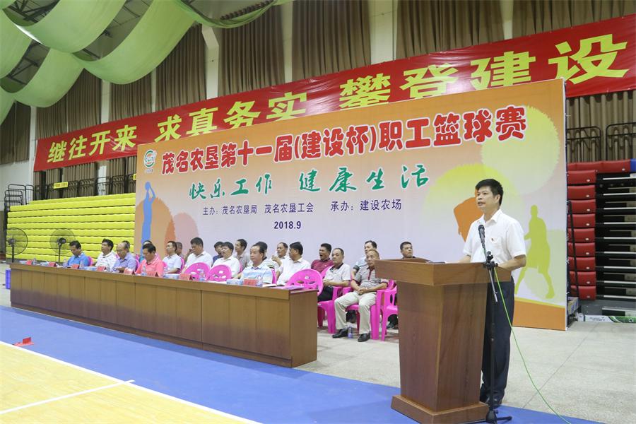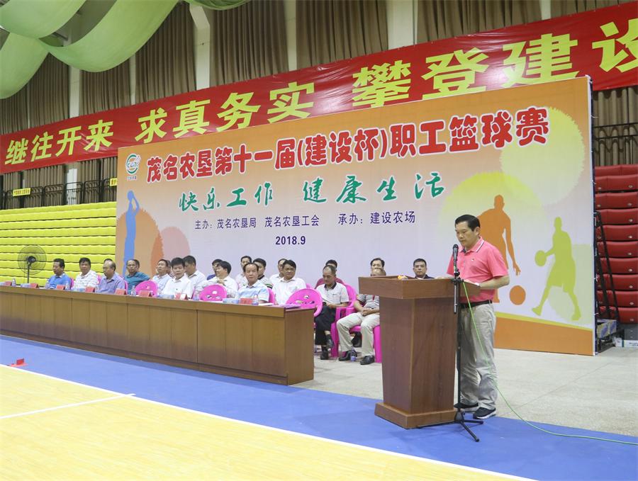茂名農(nóng)墾第十一屆(建設(shè)杯)職工籃球賽開(kāi)幕 9月20日,茂名農(nóng)墾第十一屆(建設(shè)杯)職工籃球賽在建設(shè)農(nóng)場(chǎng)體藝館拉開(kāi)戰(zhàn)幕。茂名農(nóng)墾集團(tuán)公司(農(nóng)墾局)領(lǐng)導(dǎo)潘飛,陳永光,李文炎,林勝榮出席開(kāi)幕式,茂名墾區(qū)各單位的黨委書(shū)記、場(chǎng)長(zhǎng)、工會(huì)主席參加。茂名農(nóng)墾集團(tuán)公司(農(nóng)墾局)工會(huì)主席林勝榮主持開(kāi)幕式。 茂名農(nóng)墾集團(tuán)公司(農(nóng)墾局)黨組副書(shū)記、總經(jīng)理(副局長(zhǎng))陳永光同志在講話中指出,在剛剛經(jīng)歷的臺(tái)風(fēng)“山竹”防御戰(zhàn)中,墾區(qū)各級(jí)堅(jiān)決把職工群眾的生命安全放在首位,周密部署,嚴(yán)陣以待,落實(shí)各項(xiàng)防御措施,充分體現(xiàn)了墾區(qū)干部職工隊(duì)伍敬業(yè)勤勉、不畏艱難、迎難而上的精神?;@球是墾區(qū)一項(xiàng)傳統(tǒng)的大型職工文體活動(dòng),希望各位職工運(yùn)動(dòng)員通過(guò)本次盛會(huì),展現(xiàn)茂名農(nóng)墾人昂揚(yáng)向上的活力和頑強(qiáng)拼搏的意志。